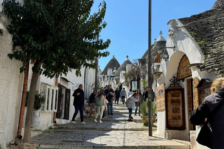 After the tour, enjoy extended free time to explore Alberobello at your own pace—wander through the lively Rione Monti, discover artisan shops, take memorable photos, or relax with lunch or an aperitivo among the trulli.