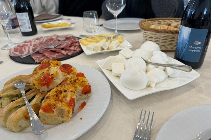 Discover authentic Apulian traditions with a farm tour, mozzarella and pasta-making workshops, and an optional tasting of local cheeses, meats, and wine—all in the charming setting of historic Masseria Cappella.